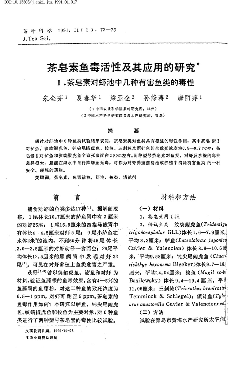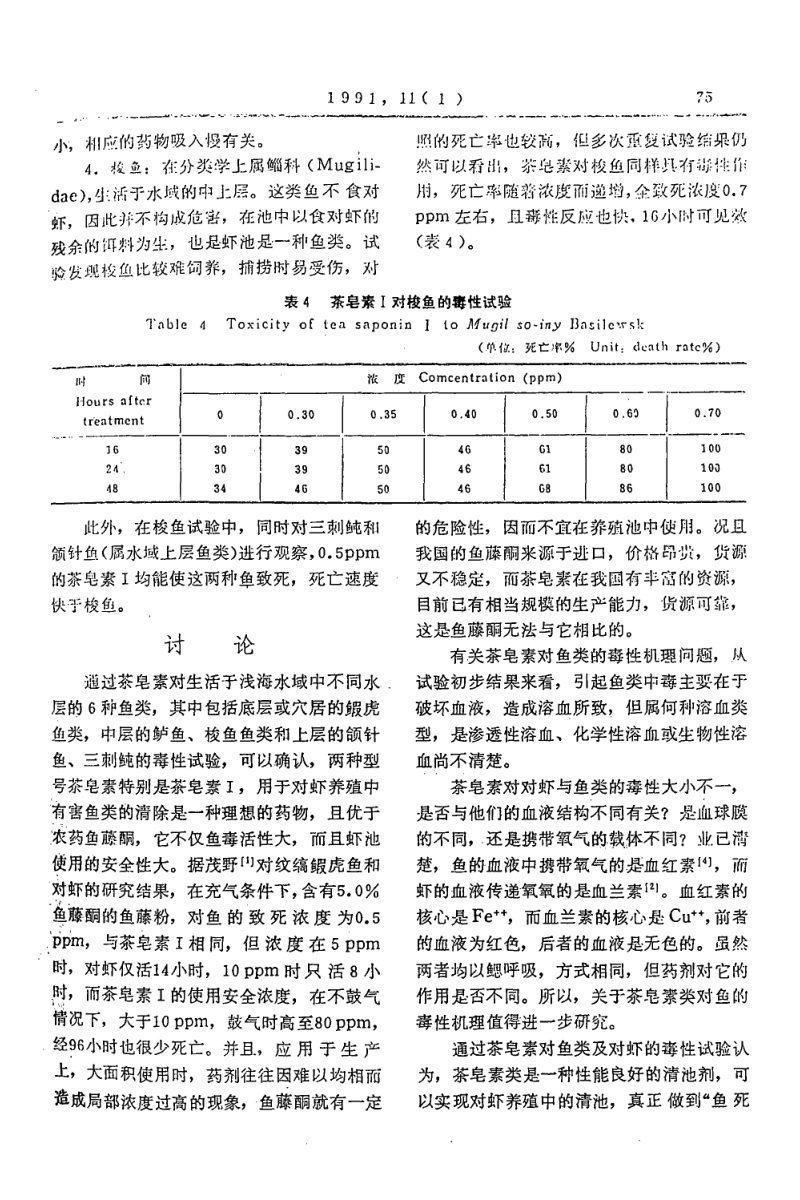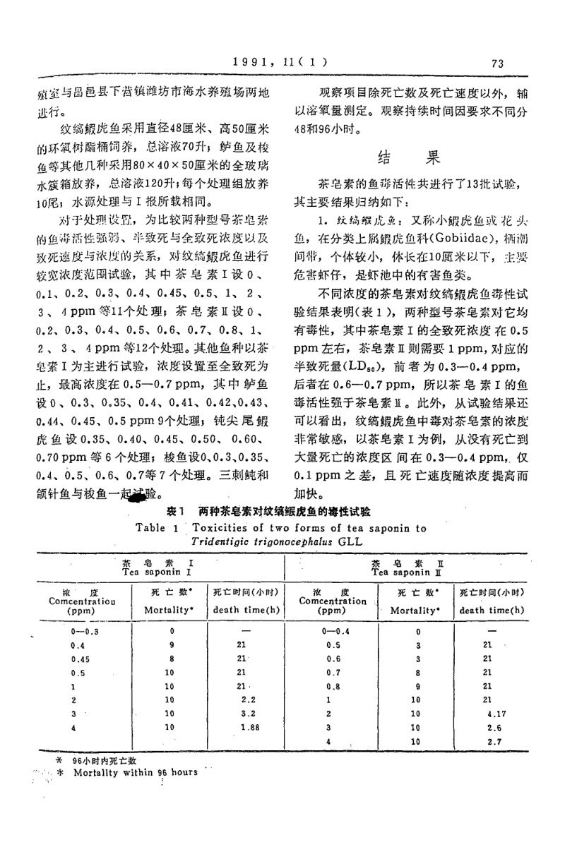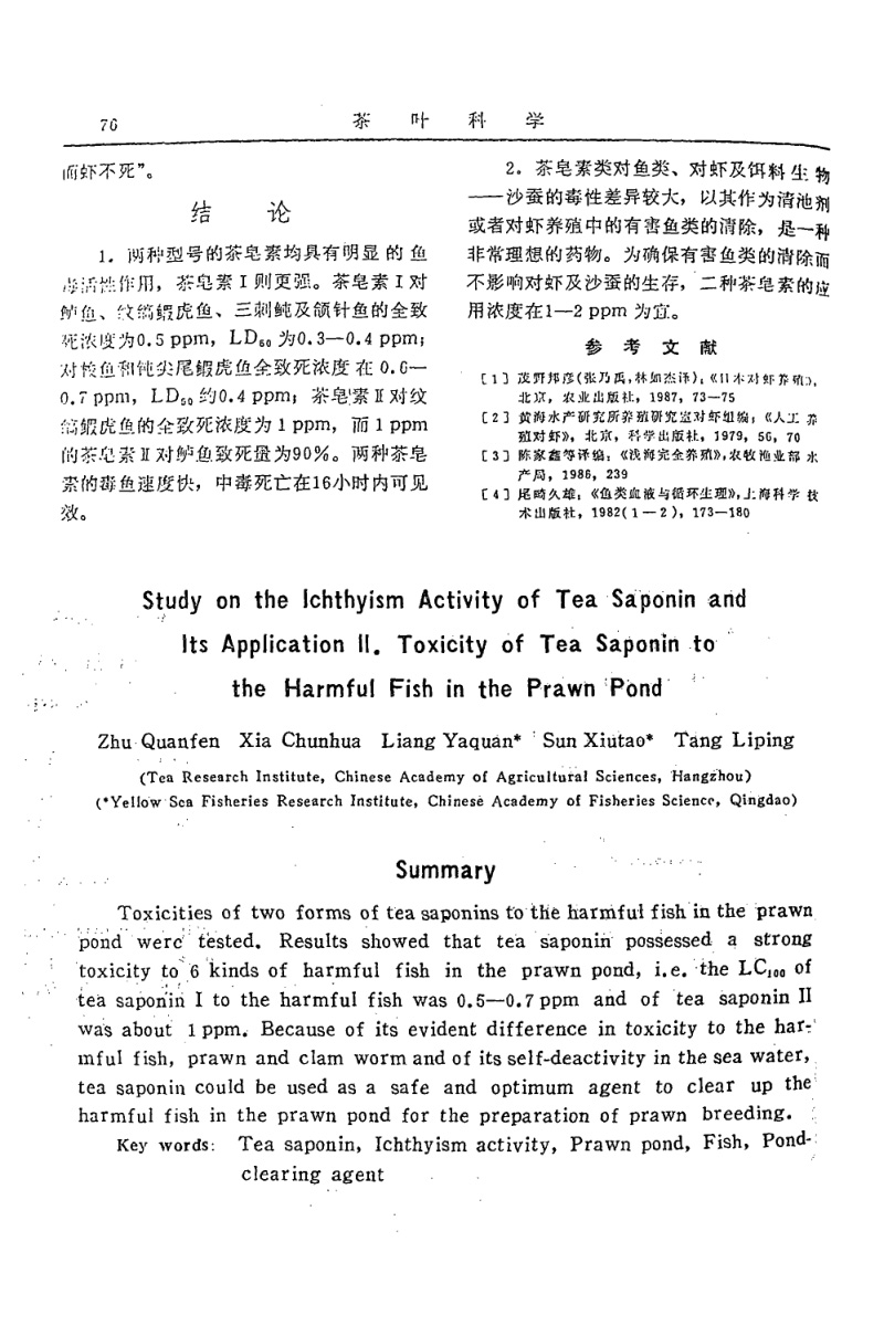 茶皂素魚毒活性及其應(yīng)用的研究—茶皂素對(duì)對(duì)蝦池中幾種有害魚類的毒性