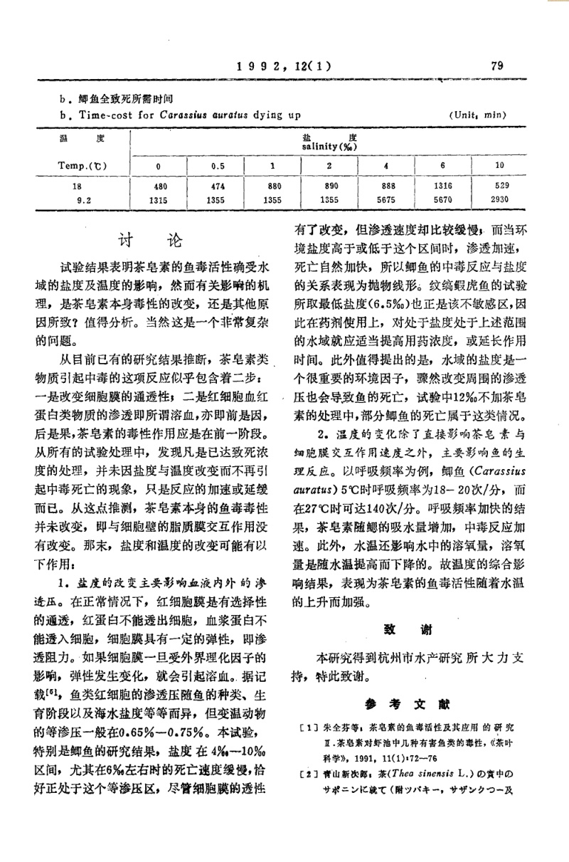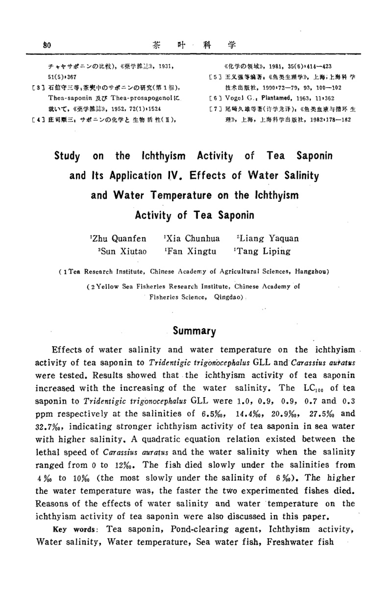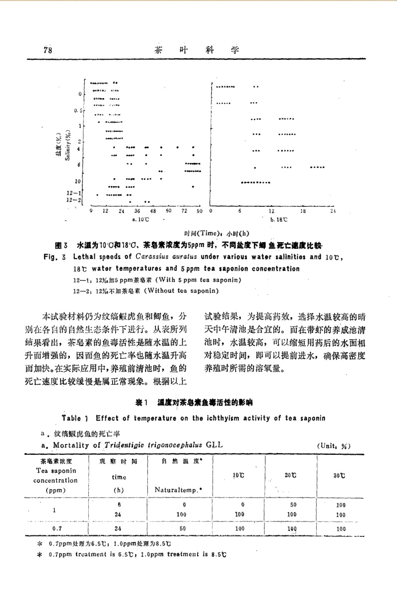 茶皂素魚(yú)毒活性及其應(yīng)用的研究—鹽度、水溫對(duì)茶皂素毒性的影響